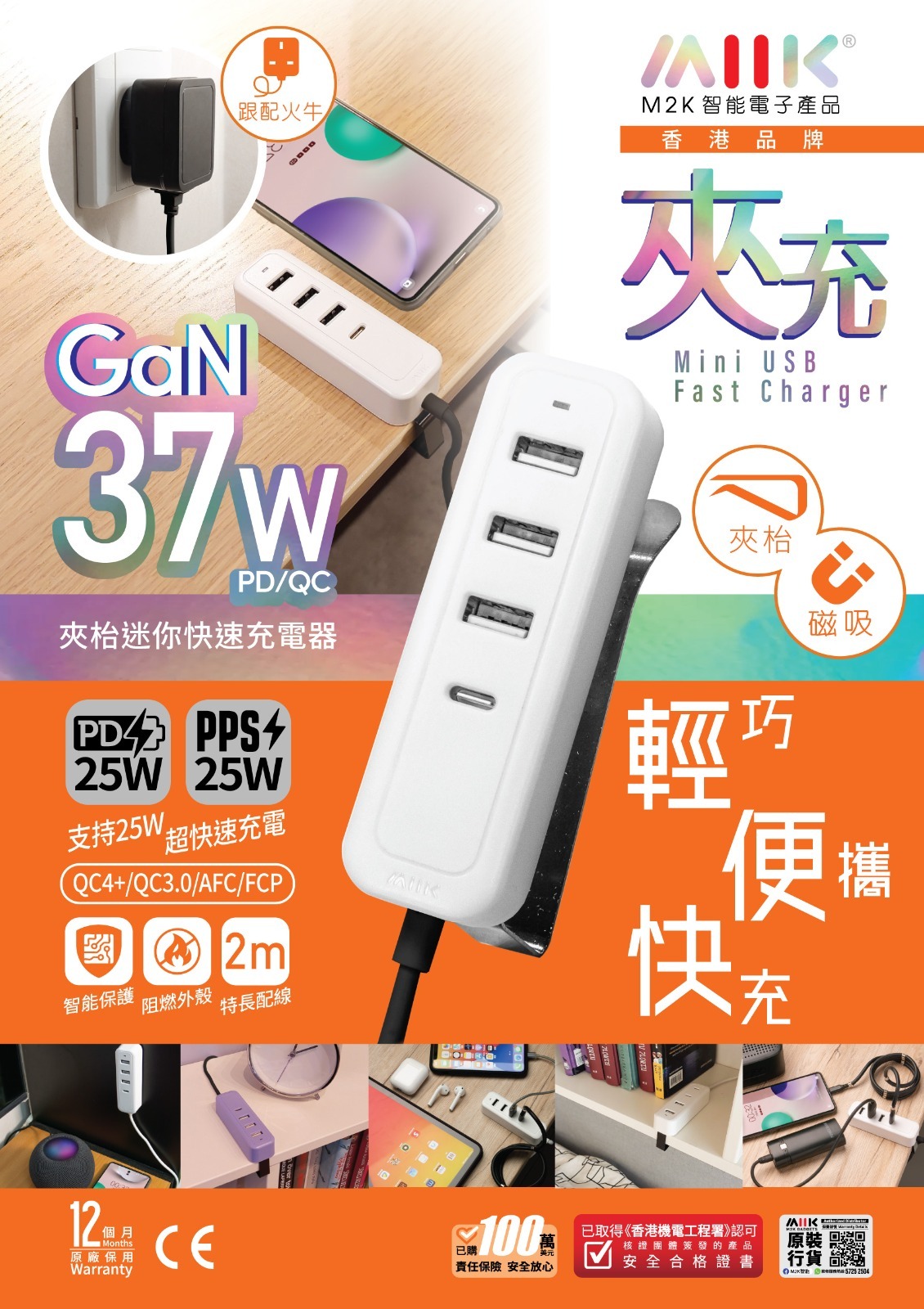 💡 GaN《氮化鎵》37W 1C3A PD25W + QC3.0 + 2.4A 夾枱迷你快速充電器