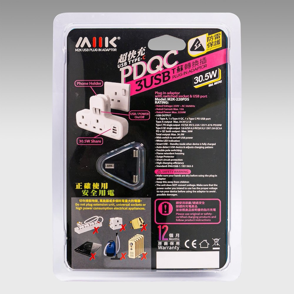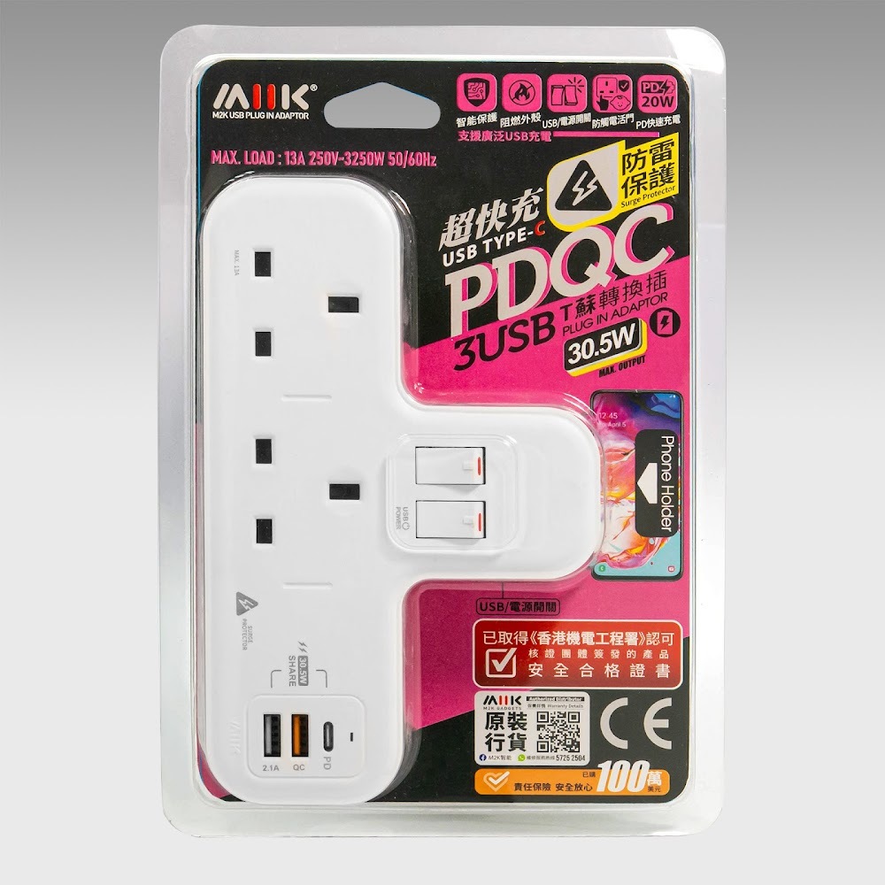 M2K T Plug In Adaptor Quick Charge, PLUG IN - GET "2 OF 13A PLUG" + "2 OF USB & 1 OF TYPE C" CE STANDARD (PD20W + Surge Protector) and 1 YEAR WARRANTY