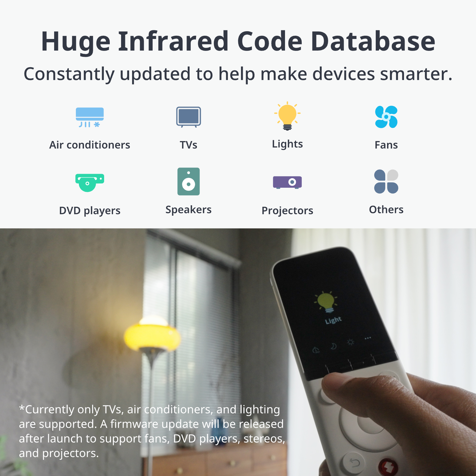 它是一個萬用遙控器!可以控制家裡的空調、電視、燈、風扇、投影機等紅外線電器等。它還支援控制 Fire TV、Apple TV 和 SwitchBot 藍牙裝置。總共最多可支援 50 個設備:15 個紅外線設備和 35 個藍牙設備,整合所有遙控器,讓您的桌面更乾淨。