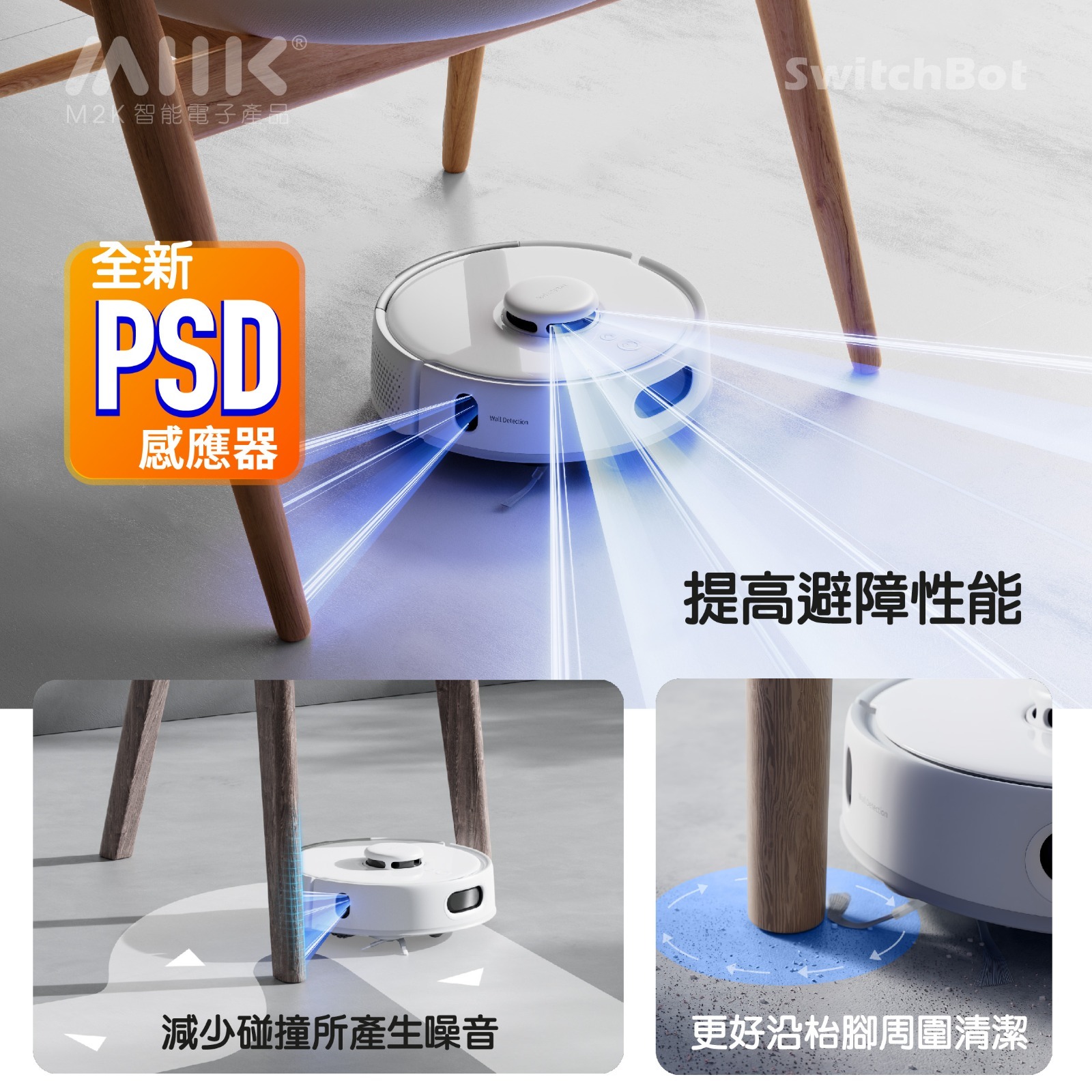 PSD 側向沿邊感測器,減少碰撞的操音『寧靜操作』可任何時間(日間/晚間)安靜地進行清潔👏